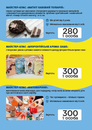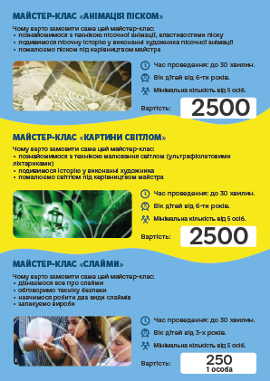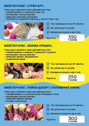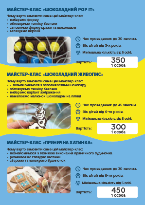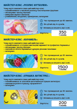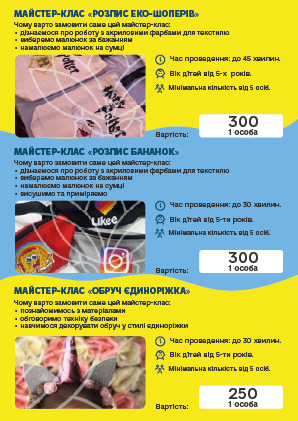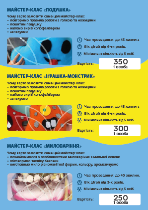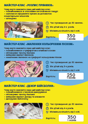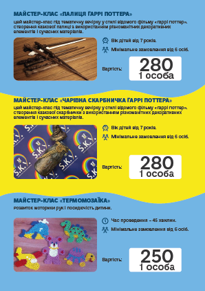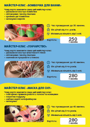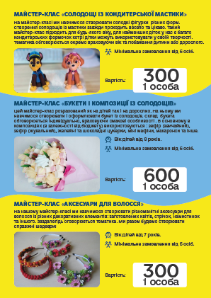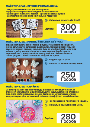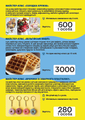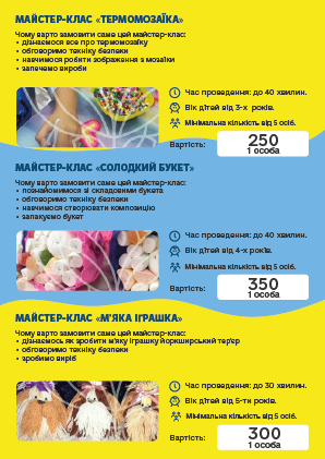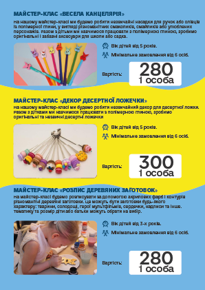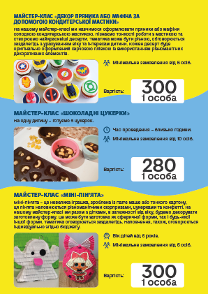 во і запам'ятовується, ПРОФЕСІОНАЛИ своєї справи доведуть «Маленьку» команду до нових перемог і досягнень. Творчі та кулінарні майстер-класи, відео розваги, ігри з аніматорами, шоу-програми та святковий стіл, підготують для Ваших дітей група фахівців в організації свят.