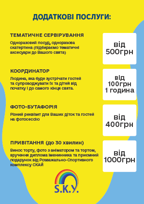 Відсвяткуйте день народження на території розважально-спортивного комплексу СКАЙ з різними послугами! Подаруйте дитині незабутні враження!