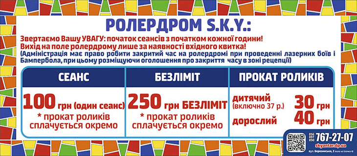 Наш роллердром є частиною спортивно-розважального комплексу S.K.Y. - додатково до катання на роликових ковзанах, прокату і навчання, ми пропонуємо величезну кількість додаткових послуг для будь-якого віку.